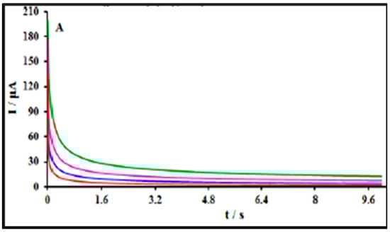 Chronoamperometry was used for the analytical determination of EP using the GQD-modified CPE prepared by Tashkhourian et al. [86] with very low LOD (0.3 nM) reported for the electrode. This was the only time CAP was applied for analytical determination of monoamines with a carbon-based QD-modified electrode. With the aid of Cottrell’s equation Equation (7), Jahani [111] calculated the diffusion coefficient, Do as 1.6 × 10−6 cm2/s from the experimental value of the current, i and square root of time, t obtained with the application of the fabricated GQDs/IL/CPE for NE detection.