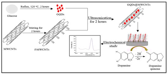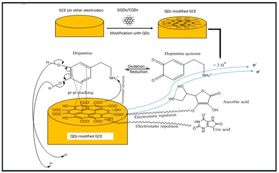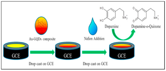 Intending to present a very sensitive electrode with good electrocatalytic activity, Jang and co-workers [98] combined AuNPs and GQDs made from the hydrothermal treatment of carbon black to form a composite that was later cast on GCE (Figure 10). This was followed by drying the modified GCE under an infrared lamp before coating with a portion of diluted nafion. The nafion coated working electrode (Au-GQDs-Nafion/GCE) was further dried under an IR lamp before application for the electrochemical detection of DA.