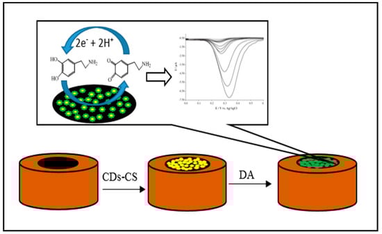 Microwave-assisted CQDs preparation from glucose and polyethylene glycol provided the CQDs added to chitosan (CS) by Huang et al. in 2013 [80] for GCE modification. The CQDs were added to CS with ultrasonication before casting the composite on GCE. The modified electrode was dried at 60 °C for about 30 min to obtain the CQDs-CS/GCE for DA detection.