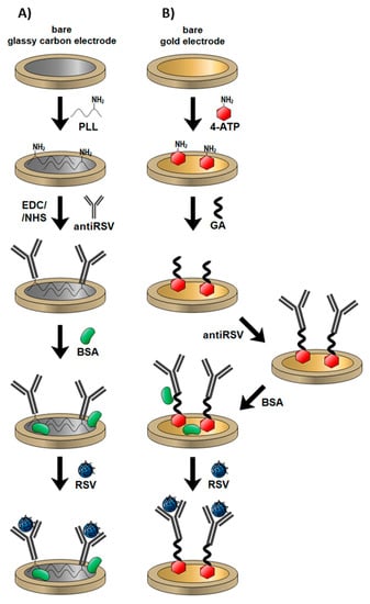Mechanisms of different electrode modifications with anti-respiratory syncytial virus (RSV) antibodies and RSV detection: (A) gold electrode; (B) glassy carbon (GC) electrode.
