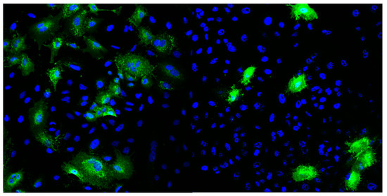 The respiratory syncytial virus (RSV) A2 strain was purchased from ATCC and amplified in HeLa cells. Cells were seeded in 225 cm2 tissue culture flasks (Falcon, Lodz, Poland) and cultured for 2–3 days until reaching 90% confluency. Example of HeLa cells with stained nuclei (blue) and RSV F protein (green) after 24 h of infection are represented in Figure 2. The medium was removed, cells were washed once with PBS, and overlaid with 15 mL of PBS-diluted RSV at an MOI of 0.1. The infection was carried out for 2 h at 37 °C. Then, DMEM medium supplemented with 2% FBS was added to a total volume of 40 mL per flask. Infected cells were cultured for 3–5 days until the cytopathic effect was evident for ~80% of the cells. Virus-containing culture supernatant was collected and clarified by centrifugation at 3000× g, at 4 °C, for 20 min. Virus particles were concentrated by precipitation with 50% (W/V) PEG6000 (Sigma-Aldrich) in NT buffer (150 mM NaCl, 50 mM Tris-HCl, pH 7.5) and stirred gently at 4 °C for 90 min. The virus was centrifuged at 3250× g at 4 °C for 20 min and re-centrifuged after removing supernatant to remove the remaining fluid. The pellet was suspended in 1 mL of NT buffer with 100 mM MgSO4, aliquoted, and stored at −80 °C. Each aliquot was used only once due to significant loss of virus activity during repeated freeze–thaw cycles.