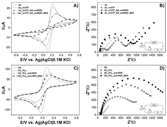 Electrochemical impedance spectroscopy (EIS) experiments are performed to evaluate the impact of consecutive steps of modifying the electrode on the impedance spectrum. EIS spectra of the bare and modified electrodes are recorded in 5 mM K3[Fe(CN)6]/K4[Fe(CN)6]/0.01 M PBS at the formal potential of the redox couple (0.150 V for Au and 0.211 V for GC). The measurements were conducted in a frequency range between 10 kHz and 1 Hz, and the spectra are presented in the form of a Nyquist plot. The results were simulated using the equivalent electrical circuit (Randles circuit) Re[CPE(RctZW)] (Figure 3B,D, inset) consisting of charge transfer resistance (Rct), electrolyte resistance (Re) combined in series with the constant phase element (CPE), and Rct. Diffusion in the low-frequency region is presented as the Warburg element (ZW). The semicircle diameter corresponds to the Rct value, which is expected to increase at each step of surface modification. This parameter was used to compare modification levels for electrodes. Calculated data are presented in Table 1. For the Au modified surface, we observe the following increases in Rct. The greatest %Rct change is for the anti-RSV step, which corresponds to the considerable size of antibodies and their anchor to the Au_4-ATP_GA surface (Figure 3B). In the case of GC, similarly to the CV data, one difference is seen in the GC_PLL and GC_PLL_anti-RSV stages, as the first impedance is higher than the second one (Figure 3D). Similarly to Au, the highest Rct value was obtained for the BSA step. This value represents the resistance for a fully prepared biosensor right before the sample is added to the system. The gradual increase in resistance with each modification step indicates the electron transfer hindrance in the electrolyte biolayer phase due to its thickness increase. The CV and EIS results show agreement that the Au and GC electrodes’ surfaces have been successfully modified.