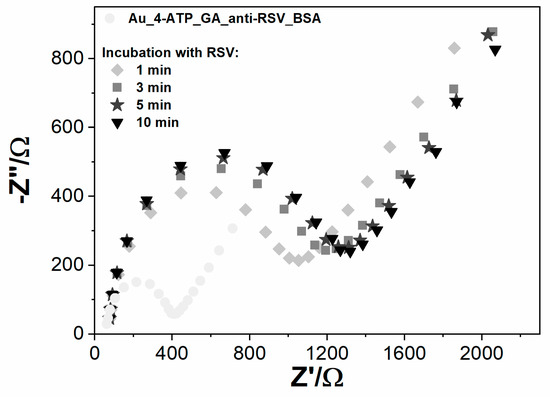 Fully prepared electrochemical sensors were used for the detection of RSV. Due to differences in the Au and GC electrode design, the detection step was slightly different in both cases. On the Au/4-ATP/anti-RSV/BSA immunosensor, the sample of RSV, dissolved in 5 mM K3[Fe(CN)6]/K4[Fe(CN)6]/0.01 M PBS, was dropped onto the modified electrode surface, and impedance spectra were recorded in time (Figure 4). In the case of GC/PLL/anti-RSV/BSA, the RSV sample dissolved in 0.01 M PBS was firstly incubated on the electrode surface for a given time. Next, it was rinsed with PBS and immediately immersed in a fresh 5 mM K3[Fe(CN)6]/K4[Fe(CN)6]/0.01 M PBS solution for EIS measurement. Table 2 presents the GC-based immunosensor response after incubation in the RSV sample, expressed as charge transfer resistance change (ΔRct). All Rct change values were calculated from the formula: