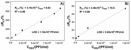 Figure 5 displays the impedance changes for tested immunosensors incubated with different RSV concentrations. The Au impedance immunosensor shows a linear relationship between the Rct change and RSV concentration within the range of 1.0 × 105 PFU/mL to 1.0 × 107 PFU/mL with a correlation coefficient (R2) equal to 0.99 (Figure 5A). In the case of GC, the electrode shows a linear response from 1.0 × 105 PFU/mL to 1.5 × 107 PFU/mL with R2 = 0.98 (Figure 5B). The GC-based immunosensor show a wider linear dynamic range than the Au immunosensor; however, the LOD obtained for the modified Au was three orders of magnitude lower than the LOD for the GC electrode. A much lower LOD for the Au-based compared to GC-based sensor could have resulted from the lower intrinsic resistivity of the gold electrode and the influence of the crosslinker type used for surface coverage. The sensitivity is 3.15 × 10−5 %(PFU/mL)−1 for Au and 2.36 × 10−6 %(PFU/mL)−1 for GC (Figure 5).