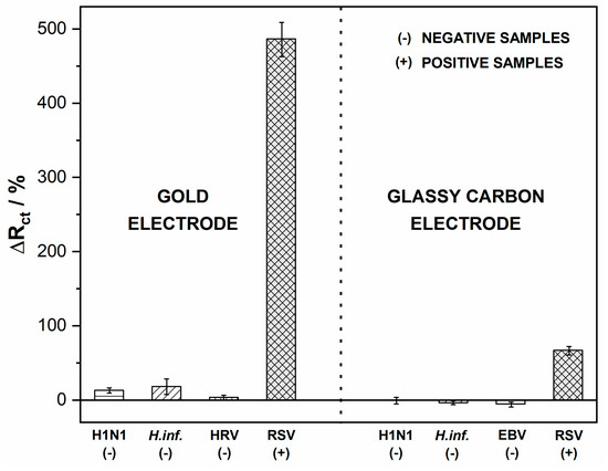 After verifying the signal alteration after the RSV binding to the electrode surface, the platform’s usability was tested on the pathogen samples. To validate the biosensors’ response in a real environment, we simulated throat conditions by incubating the biosensing electrodes with various common throat-infecting pathogens, including Haemophilus influenzae, rhinovirus (HRV), Epstein–Barr virus (EBV), and H1N1 influenza A virus. They were used as potentially interfering pathogens to investigate the selectivity of the immunosensors. The samples were incubated with the tested immunosensors for 5 min, and unbound viral particles were flushed away with deionized water. Next, the EIS spectra were recorded and relative ΔRct values were calculated. Direct coupling of RSV antigen caused an impedance increase in both the Au biosensor and GC biosensor. The percentage change of Rct for negative samples did not exceed 15% (Figure 6). For negative samples, the charge transfer resistance did not change significantly, which proves no unwanted interaction of the bacteria with the biosensing electrode surface. The small decrease in Rct values in the cases of Haemophilus influenzae and EBV samples on GC could have been due to a high load of non-specific bacteria. The above results confirmed the specificity of both developed sensors in the presence of negative buffers and positive RSV samples. The negative samples were proved to give no cross-reactivity, indicating that the proposed methods have high selectivity for detecting RSV (Figure S2).