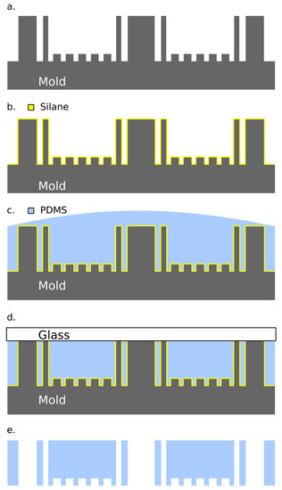 - Muluneh, M.; Issadore, D. A multi-scale PDMS Fabrication strategy to bridge the size mismatch between integrated circuits and microfluidics. Lab Chip 2014, 14, 4552–4558. [Google Scholar] [CrossRef] [PubMed]