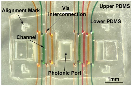 We demonstrate the functionality of the described microfluidic packaging by injecting colored dyes to detect leaks between channels. In Figure 5, colored dyes are injected into a 10-channel microfluidic device with 150 m edge to edge channel spacing using edge coupling tubing with 28-gauge needles. One channel is kept empty as a reference. There was no cross contamination of dye in either the lower chip-sized PDMS channels or the larger upper PDMS channels. This test was done on glass for high contrast to best visualize any leaks. Once the proof of concept was verified while using dye on glass, a 10-channel microfluidic package with a 200 m edge to edge channel spacing was aligned to 5 m radius MRRs and optic fibers were aligned with grating couplers on-chip for photonic coupling.