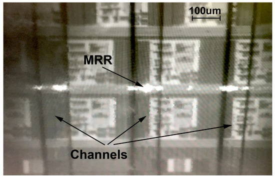 Channels of the assembly were aligned to rings, as described above. Subsequently, 125 m diameter lensed fibers are lowered through the photonic ports while using micromanipulators on an optical table. These fibers are aligned to on-chip grating couplers to couple laser light into a waveguide. When the wavelength of the input light is at the resonant wavelength of an MRR, power couples into, and circulates within, the micro-ring resulting in a power loss at the output coupler [22]. Figure 6 is an infrared image of channels that are aligned to the MRRs of a fully integrated electronic-photonic system on-chip. Photonic coupling is demonstrated by the circulating power emanating from the micro-rings.
