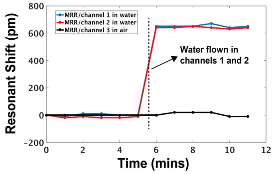 The bulk sensing capability of the platform was then evaluated using the proposed microfluidic packaging strategy. Light from a tunable laser (SANTEC TSL-510), which has the ability to change the wavelength of light output under fine control, is guided to a row of ring resonators. For these experiments, the light from the laser was swept from 1298 nm to 1308 nm. The laser performs multiple wavelength sweeps of the ring row’s output at a step of 10 picometers (pm). The output power is measured with a power meter (Agilent 8164B). For each sweep, the resonant wavelengths of the rings are captured and their difference from the nominal resonances of the initial sweep (resonant shift) is calculated. Figure 7 shows the resonant shift of three rings that were located in three different channels. Channels 1 and 2 are exposed to water, while channel 3 is empty. A resonant shift of 650pm was measured for the sensors under water. By characterizing the RI of water with an ATC refractometer (RI = 1.3334), a bulk sensitivity of 1.95 nm/Refractive Index Unit is calculated by dividing the resonant shift with the change of the RI from air to water (). This high channel density and miniaturized microfluidic device has the potential to integrate with a variety of silicon photonic devices.