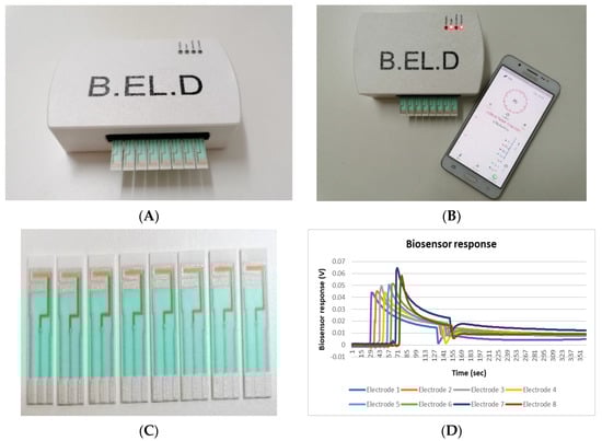 - Dataset: The dataset contained 200 measurements from 100 negative and 100 positive samples. Each measurement consisted of the data obtained by the 8 screen-printed electrodes that recorded the cell response as a time series of potentiometric measurements (in Volts) and comprised 360 values per electrode (sampling rate of 2 Hz). The detected measurements were visualized through a voltage/time graph (Figure 1D).