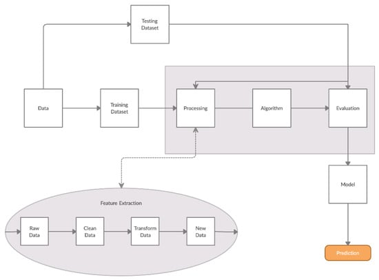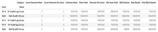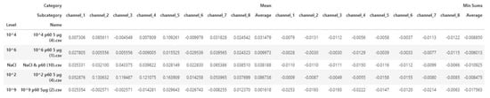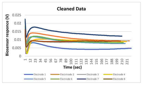 - Processing/Feature Extraction: The processing of the dataset was performed in a two-step procedure. In the first step, peaks were determined and starting noise was cleaned to smooth and calibrate the signal before the first peak. Then, all values were shifted to start at y = 0 and from each experimental dataset values from 120 to 200 were shifted at x = 0 and kept for further analysis (Figure 3). In the second step, feature vectors were extracted from the cleaned data and used as input to develop an algorithm able to detect L. monocytogenes in sterile saline samples. Each feature vector was calculated based on the following: (a) the average values (mean) for each cleaned dataset and (b) the rolling average with rolling window size 50 (minimum sums) [30]. This procedure was applied in each electrode channel (channel 1, channel 2, etc.) and the overall test dataset (mean average and minimum sums average for all 8 electrodes) (Figure 4). Hence, from the initial experimental raw dataset with 360 × 8 values, only 1 × 18 (1 values for each channel (8 values in total) + 1 overall value/(a) and (b)) feature values were used for the sample discrimination and the algorithm development.