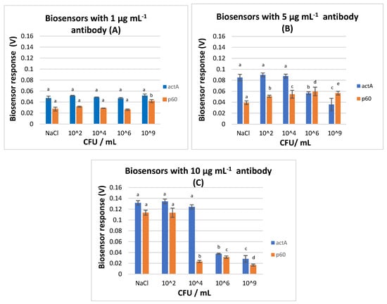 3.1. Antibody Selection and Biosensor Response in the Presence of L. monocytogenes