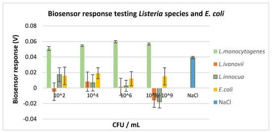 - Cheng, C.; Peng, Y.; Bai, J.; Zhang, X.; Liu, Y.; Fan, X.; Ning, B.; Gao, Z. Rapid detection of Listeria monocytogenes in milk by self-assembled electrochemical immunosensor. Sens. Actuators B Chem. 2014, 190, 900–906. [Google Scholar] [CrossRef]
