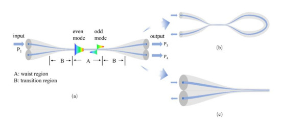 Depending on the fusion degree, MFCs may be classified into weakly fused MFCs and strongly fused MFCs [87]. For weakly fused MFCs, the two identical microfibers roughly maintain their original cross-section geometries; they possess dumbbell-shaped cross sections. In this case, the aspect ratio, which is defined as the ratio between waist width and height of the cross-section at the waist region of MFC, is usually larger than 1.8. However, strongly fused MFCs have an aspect ratio that varies from 1.0 to 1.8 [29,88]. In practical, strongly fused MFCs have elliptical- or circular-shaped cross-sections, the coupling lengths are longer than that of weakly fused MFCs, and critical diameters are larger compared with weakly fused MFCs. Moreover, strongly fused MFCs show weaker dependence on polarization and external RI change than weakly fused MFCs. As a result, weakly fused MFCs are more appropriate to develop as sensors [87,88,89,90].