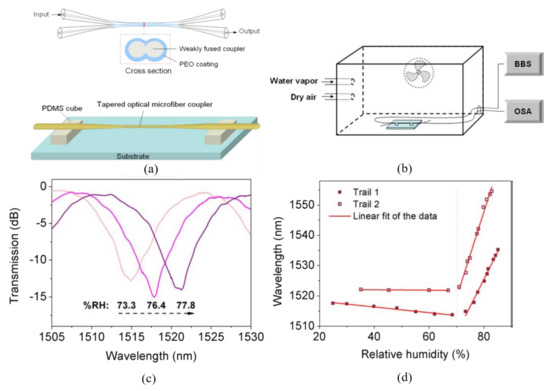 The schematic of an MFC-based humidity sensor fabricated by Bo et al. [61] is shown in Figure 3a. The PEO layer is deposited on the surface of the coupler, and then the coupler is fixed on two PDMS-made cubes with the sensing region suspended in the air. The researchers fabricate two identical MFCs (sample 1 and sample 2) to accomplish the sensing experiment in a humidity-controllable chamber, as described in Figure 3b. By tracking the dip wavelengths at different surrounding relative humidity, from 25% to 85%, the sensitivities of two MFCs may be observed explicitly in Figure 3d. It appears that the sensitivities of the sensors are very low in the relative humidity (RH) range of 25% to 70%. However, they increase dramatically in the RH range of 70% to 85%. This phenomenon may be explained by a phase conversion of PEO from semicrystalline to gel around 80% RH. The RI of the PEO layer decreases drastically at the phase-converting point, due to the fact that density reduction of PEO results from an increase in swelling of the PEO as its water content increases. Utilizing this unique principle, the PEO coated MFC serves as a high-sensitivity humidity sensor in the RH range from 70% to 85%. Figure 3c shows the transmission spectra of sample 1 at the RH of 73.3%, 76.4%, and 77.8%, respectively. The redshift of the dip is observed as the RH increases. The sensitivities of sample 1 and sample 2 are 1.71 and 2.74 nm/%RH in the range of 70% to 85%, respectively.