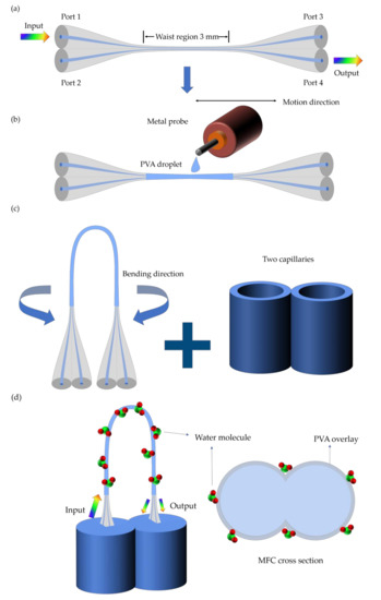 Zhao et al. developed a probe-type relative humidity sensor by coating the U-shaped MFC with a PVA film [64]. The structure is novel, and the width of the probe is less than 1 mm, which facilitates potential practical applications in narrow places such as pipes or Petri dishes. The PVA film is widely extended in the field of detection and control of humidity, owing to its perfect performance of absorbing water vapor. After the absorption of water vapor, the volume of PVA film changes drastically and an RI change is induced. To fabricate the U-shaped MFC-based humidity sensor, the preparation processes are briefly shown in Figure 4.