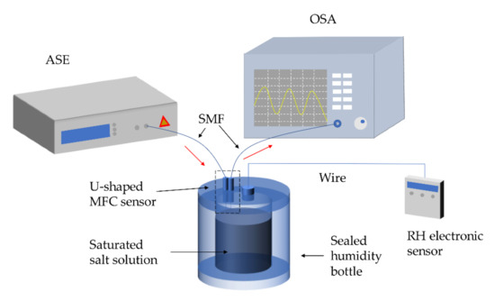 The MFC is fabricated by the heating-and-pulling method. Then the PVA solution (20 wt%) is made by dispersing the PVA granules into ultrapure water, under the temperature of 80 °C, for 50 min, dropping it uniformly on the waist region of the MFC. After drying for 20 h at room temperature, it is fixed in a U-shape. The two capillaries are used to protect and fixed the MFC. As shown in Figure 5, the RH electronic sensor is used to calibrate the RH and temperature in the sealed the humidity bottle. Slightly different from the experimental setup of Reference [61], this work places the sealed bottles with the salt solutions to meet the requirement of the humidity environment. By recording the corresponding transmission spectra and RH value for each salt solution, the sensitivity for the humidity of this sensor per case is obtained. The highest sensitivity of the U-shaped MFC humidity sensors with a waist diameter of 5.7 μm and waist length of 3 mm reaches 318.1 pm/%RH with good linearity in the wide RH range of 15% to 85% RH. Meanwhile, a low-temperature cross-sensitivity of 13.9 pm/°C from 20 to 50 °C was investigated in this work. Sun et al. [57] and Bai et al. [31,66] realized simultaneous measurement of humidity and temperature by coating the MFC with silica gel and MoS2. The sensitivities of 1.6 nm/% RH in the range from 70% to 86% RH, 0.55 nm/°C in the range from 20 to 40 °C, 176.6 pm/%RH in the range from 60.6% to 78.6% RH, and −123.5 pm/°C in the range from 20 to 80 °C were obtained, respectively.