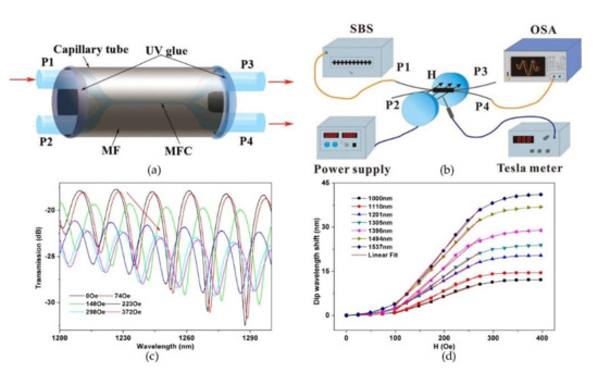 Magnetic field sensors have been used to detect the intensity of the magnetic field and have developed rapidly in recent years. Magnetic field sensors based on MFC may perhaps be categorized into RI-induced and shape-induced. RI-induced magnetic sensors rely on the sensing materials perhaps as a response to ambient magnetic change; shape-induced magnetic sensors depend on the deformation of MFC under physical force. For the first situation, magnetic fluid (MF) is often employed to package the MFC. MF is a kind of functionalized material whose RI varies significantly as the magnetic field intensity change and is generally made by dispersing the magnetic particles with a diameter typically less than 10 nm into solution. With the aid of MF, several highly sensitive magnetic field sensors based on MFC have been investigated. In the same year as Reference [68], Luo et al. proposed a magnetic-field sensor by immersing the MFC with a fiber diameter of 1.8 μm and waist length of 10 mm into the MF environment and well packed in a capillary tube [67]. In the experimental setup, the sensor was placed between two poles of an electromagnet, which can generate a uniform magnetic field with uniformity of larger than 99.9% within the sensing region, and a Tesla meter was used to calibrate the intensity of the magnetic field. The schematics of the sensor and experiment setup are in Figure 6a,b.