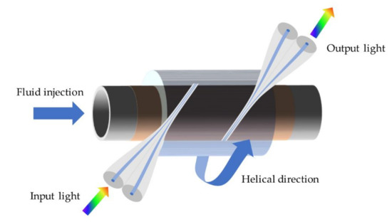 Microfluidic flowmeters perform a vital role in molecule detection, cell sorting, and counting. In 2016, Yan et al. reported a novel microfluidic flowmeter based on a helical MFC and a gold-coated glass capillary [70]. The schematic is shown in Figure 7. The MFC is wrapped around the capillary. When the evanescent field is absorbed by the gold film, the heat is generated, and the MFC is warmed. When the microfluid flows through the capillary, heat is taken away, and the temperature of the MFC decreases. As a consequence of temperature change, the dip wavelength of MFC would shift in transmission spectra of output ports. The intensity of dip shift corresponds to the different flow velocities; the device works as a “hot-wire” microfluidic flowmeter.