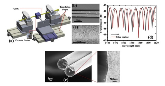 (a) The fabrication setup of MFCs; (b) the fabricated MFC sensing unit; (c) the mesoporous silica coating on the surface of the MFC; (d) transmission spectral responses of the MFC before and after it is coated with mesoporous silica layer; (e) the cross-section of the fabricated MFC sensing unit. Copyright (2019) from Reference [74].