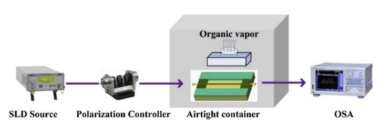 In 2019, Zu et al. proposed a chemical sensor based on MFC loop to detect the concentration of chloride ions by tracking the dip wavelength shift in chloride ion solutions of different concentrations [26]. However, the selectivity to chloride ion has not been established. Selectivity is an essential evaluation factor for a chemical sensor and shows the possibility of crosstalk with other foreign substances. Zhou’s group propose an MFC sensor with a mesoporous silica coating to realize the the detection of airborne molecular contaminants (AMCs) [74]. With the help of mesoporous silica, the absorption ability to AMCs has been enhanced. The fabrication process and sensing experiment setup are described in Figure 8 and Figure 9, respectively.