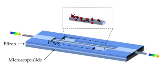 The fabricated MFC has a waist diameter of 4 µm and two transition regions of 13 mm on each side. For the encapsulation process, a thin layer of the UV curable polymer was employed to cover the silica slide, and then two blocks of PDMS were utilized to create an open-top channel. The MFC remained placed into the channel; UV curable Efiron polymer was employed to block two ends of the channel and the MFC. Because fibrinogen molecule has excellent immobilizing properties on silica surfaces, it is not necessary to silanize the MFC. After human fibrinogen turns immobilized on the surface of the sensor, the sensing area is fully covered with 0.2 mL phosphate-buffered saline (PBS), and the transmission spectrum is found recorded as the baseline, the sensing experiment is carried out by replacing the PBS with different rabbit anti-fibrinogen solution in PBS. In the detection range from 0 to 100 µg/mL, the spectral shifts nearly 10 nm. However, the estimation of specificity was not shown in this work.