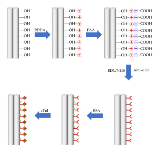 In References [77,78], the layer-by-layer self-assembly method was introduced to enhance the specificity and stability. This method corresponds to a nanofabrication technique to obtain a polyelectrolyte multilayer by immersing the fiber into aqueous polyelectrolyte solutions with an opposite electric charge under the electrostatic force between adjacent layers [100]. This technique remains widely used in optical fiber chemical and biological sensors, combining the optical fiber technology with nanotechnology [101,102,103]. For example, the process of waist surface modification and antibody immobilization in Reference [77] is shown in Figure 11.