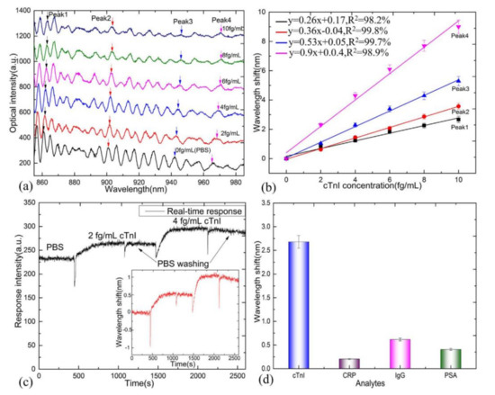 - Zhou, W.; Li, K.; Wei, Y.; Hao, P.; Chi, M.; Liu, Y.; Wu, Y. Ultrasensitive label-free optical microfiber coupler biosensor for detection of cardiac troponin I based on interference turning point effect. Biosens. Bioelectron. 2018, 106, 99–104. [Google Scholar] [CrossRef]