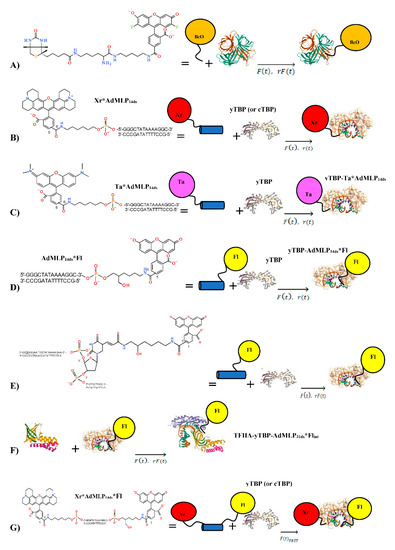 The dye-labeled top strands and the corresponding complements were synthesized by TriLink Biotechnologies, Inc. (San Diego, CA, USA). All strands were both HPLC and PAGE purified and the correct labeling was confirmed by comparing the dye’s peak absorbance ratios with respect to the 260 nm DNA absorbance [40]. The duplex DNA (ds) was prepared using a 10 × molar excess of complementary strands with a preincubation time of at least 20–30 min before reaction mixing. The dye-labeled top strand contained the TATAAAA box sequence from the Adenovirus Major Late Promoter (AdMLP) that is bound and bent by TBP [41]. Several dyes were used to label a 14-nucleotide top coding strand bearing the AdMLP (AdMLP14ds) and giving fluorescent probes of different sensitivity (Table 1, Figure 1). These dyes were attached to the single-strand oligomer probes by six-carbon linkers at the 3′ end with fluorescein (3′-Fl), and at the 5′ end either with x-rhodamine (5′-Xr) or TAMRA (N, N, N′, N′-tetramethyl-6-carboxyrhodamine, 5′-Ta). After complement binding, the duplexed probes were named AdMLP14ds*Fl, Xr*AdMLP14ds, and Ta*AdMLP14ds, respectively. A fourth single-labeled probe was a 31-nucleotide AdMLP sequence labeled with an internally labeled carboxy Fl attached to thymine (dT-Fl) by a nine-atom linker, which was named AdMLP31ds*Flint, and was designed to accommodate simultaneously the TBP and TFIIA proteins (Table 1, Figure 1). A double-labeled probe, Xr*AdMLP14ds*Fl, was designed as a FRET probe to yield the F(t)FRET trace that monitors the donor quenching by energy transfer caused by DNA bending during the cTBP and yTBP binding. All the preformed duplex probes were placed in syringe 1 with at least 20–30 min incubation to reach the desired temperature under the water bath. The concentration of single and double labeled duplexes for all the SF experiments varied from 20 nM to 60 nM and to make comparative analysis between these different methodologies, it was needed to keep the protein/probe ratio constant.