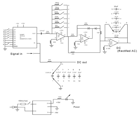 Circuit diagram for the dual-channel SF filtering box. The frequency selection circuitry filtered out the r(t), and F(t) traces by getting the ratio of VAC(t)/VDC(t), according to Equation (7) and Equation (8), respectively. The fluorescence emission that passes the interference filter (e.g., 520 nm, 580 nm, and 620 nm) produces a PMT analog signal (signal in) that is split into two, the first half goes through an adjustable resister-capacitor filter (RC) to obtain a clean VDC(t) signal out. This RC filter has a variable capacitor set for the following time constants of 1 ms, 10 ms, 50 ms, 100 ms, and 500 ms and 1 sec for the dials starting from 1 to 6. The second split signal passes through an 828BP 4-pole-pair digitally programmable band-pass filter (Frequency Devices TM, Inc.) to isolate the 50 kHz signal, which is then fed to an active high-pass filter and later to a half-wave rectifier with negative output. Finally, the signal is fed to an integrator with a capacitor selector to yield the VAC(t). The configuration of these electronic elements is powered by a 12V power supply. Further details are described in the text.