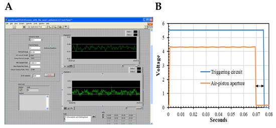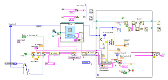 The data acquisition was managed by an instrument control software (8.0 LabVIEW™) to sort each channel into two separate spreadsheets (Figure 4). The converted digital data was collected at a rate of 1530, 3060, or 6120 data points per second for 655 μs, 327 μs, and 163 μs separation per data points whose signals from each channel were baseline subtracted. The two analog signals from the demodulator were digitized by PCI-5122 high-speed digitizers from National Instruments (Austin, TX, USA) with a 14-bit resolution and 100 MHz bandwidth, through channel 0 and 1, the instrumental control panel of which is shown in Figure 5.