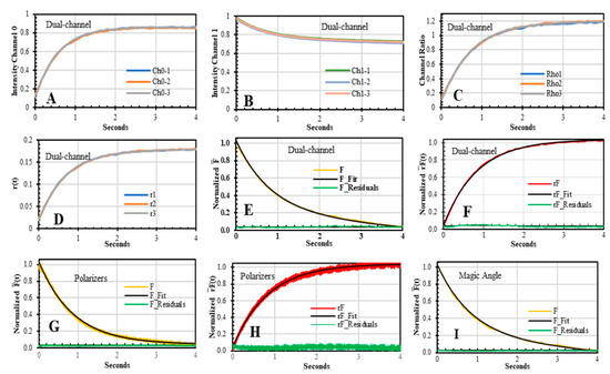On the other hand, the ΔF(t) dropped by 25% and produced a small distortion in the r(t) traces; therefore, the r(t) needed to be analyzed as rF(t), as shown in Equation (15) [17]. As the AV-BcO complex is formed, the rotation of the probe decreased as shown by the traces, which were collected only by two SF methodologies: polarizers and dual-channel SF (Figure 6F,H). The traces acquired by these methodologies yielded equivalent eigenvalues, which were also in perfect agreement with the information obtained by the sensing modality. Thus, and traces yielded kon overlapping values, which indeed validated the accuracy of the dual-channel SF methodology (Table 3, Figure 6).