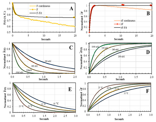 Concentration and temperature dependence of the AV-BcO association kinetics. (A,B) The F(t) and sensing modalities were collected with the dual-channel SF under continuous (pale line) and discontinuous (dotted line) laser excitation at 488 nm. The F(t) trace, under continuous excitation, showed a second eigenvalue (λ2) that ranged from 0.02 s−1 to 0.01 s−1 caused by photobleaching. In contrast, when the excitation was blocked, the intensity stayed constant after the reaction was completed, so that, the intensity decreased by 25.3 ± 2.2% and it was proportional to a change in the QY of 0.91 ± 0.01 for the free BcO probe and the 0.68 ± 0.02 of the AV-BcO complex (Table 2). (C,D) The concentration-dependence of the binding reaction of BcO (20 nM) and AV (200 nM, 260 nM, 520 nM and 1040 nM), at 20 °C, for both and sensing modalities, respectively. (E,F) The temperature-dependence in the binding reactions of BcO (20 nM) and AV (260 nM) at 10 °C, 15 °C, 20 °C and 25 °C, were tracked by and modalities. The black lines corresponded to the fitted curves that yielded the λ and kon values, shown in Table 4.