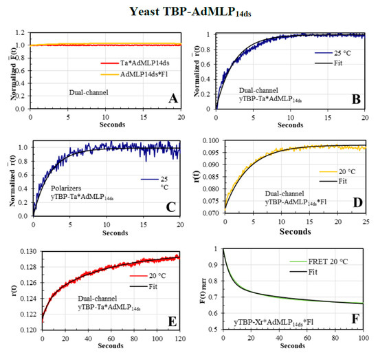 The F(t) traces of yTBP binding to the Ta*AdMLP14ds and AdMLP14ds*Fl probes did not show any fluorescence change (Figure 8A). On the other hand, the sensing modality tracked very well the binding process (Figure 8B,C); therefore, the association kinetic can be studied with the traces and there is no need to obtain the product as in the AV-BcO case (Figure 6 and Figure 7). To ensure that dual-channel traces were reliable for the yTBP-Ta*AdMLP14ds complex formation, we compared them with the traces acquired by the polarizer methodology, at 25 °C (Figure 8B,C). Indeed, both methodologies yielded traces that resulted in overlapping λ values in the error (Figure 8B,C) that yielded the initial rate constant (k+1), at 25 °C, of the complex reaction mechanism previously elucidated by F(t)FRET, which consisted of six rate constants for a two-intermediates reaction [11].