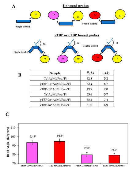 To further evaluate the dual-channel r(t) traces, we compared yTBP binding, at 20 °C, with the single labeled AdMLP14ds*Fl (Figure 8D), Xr*AdMLP14ds (Figure 8E), and the FRET Xr*AdMLP14ds*Fl probe (Figure 8F), at the same protein/probe ratio. The ΔF(t)FRET traces dropped 34.0% ± 2.0% (Equation (15)) for the yTBP-Xr*AdMLP14ds*Fl and the F(t)FRET traces were described by three eigenvalues (λ1, λ2, and λ3) whose faster component matched with the one observed with the r(t) traces (Figure 8D,E). The r(t) traces of yTBP-AdMLP14ds*Fl and yTBP-Ta*AdMLP14ds, at 20 °C, yielded kon values that overlapped in error between each other and as well with the k+1 acquired in this study by F(t)FRET and elsewhere [11]. To analyze conformational changes, we acquired the time-resolved FRET (trFRET) of the free single labeled AdMLP14ds*Fl and bound to yTBP and cTBP. We also obtained trFRET of the unbound double-labeled Xr*AdMLP14ds*Fl and Ta*AdMLP14ds*Fl, and the respective yTBP and cTBP complex (Table 5) to obtain the and σ parameters for free duplexes and complexes (Figure 9A,B). The trFRET lifetime in ns, Σαiτi or τD(A), of the free and yTBP bound probe, Xr*AdMLP14ds*Fl and yTBP-Xr*AdMLP14ds*Fl were 1.575 ns ± 0.066 ns and 1.042 ns ± 0.040 ns, respectively. The ΔtD(A) between the free Xr*AdMLP14ds*Fl and bound to the yTBP-Xr*AdMLP14ds*Fl complex was 33.8% ± 2.0 % and it was equivalent to the observed ΔF(t)FRET in the association traces. Likewise, the ΔtD(A) when Ta was used as acceptor was 33.5% ± 1.7% (Table 5). The bend angles α were equivalent for both yTBP-Ta*AdMLP14ds*Fl and yTBP-Xr*AdMLP14ds*Fl complexes with values of 79.8° and 79.2°, respectively (Figure 9C).