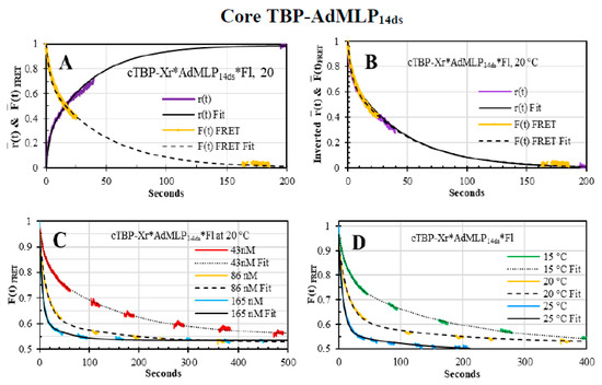 The binding association of the yTBP and cTBP proteins to AdMLP14ds was tracked with the double-labeled Xr*AdMLP14ds*Fl probe. The Fl donor emission was acquired with the previously described 520-nm interference filter yielding the F(t)FRET traces whose intensities decrease as the acceptor (Xr) gets closer to the Fl dye caused by the DNA bending as TBP binds to the probe [2,3,49]. In other words, the F(t)FRET trace tracks the quenching of the donor as a function of the time due to the energy transfer towards the acceptor [2]. The F(t)FRET association traces were acquired in the previously described SF apparatus in which the analogous signal was fed directly to the digitizer. The resulted F(t)FRET traces were described by exponential decay models according to Equation (19). The excitation light was provided by the previously described Coherent Ar+ ion laser at 488 nm and 10–20 mW power.