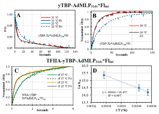 After confirming that the longer probe is functional, we pre-formed the binary yTBP-AdMLP31ds*Flint complex and reacted with TFIIA, at 15 °C, 17 °C, and 25 °C, which was tracked by the rF(t) sensing modality (Figure 11C). The kon values of TFIIA binding to the binary complex, at 15 °C 17 C, and 25 °C, were 1.45 (±0.3) × 106 M−1s−1 and 4.68 (±1.59) × 106 M−1s−1. There is a reported dissociation rate constant of the ternary TFIIA-TBP-TATA of 7.1 × 10−4 s−1 at room temperature [38], which let us estimate the KD values between 2.1 nM and 6.6 nM for yTFIIA and the binary yTBP-TATA complex, between the 15 °C and 25 °C range.