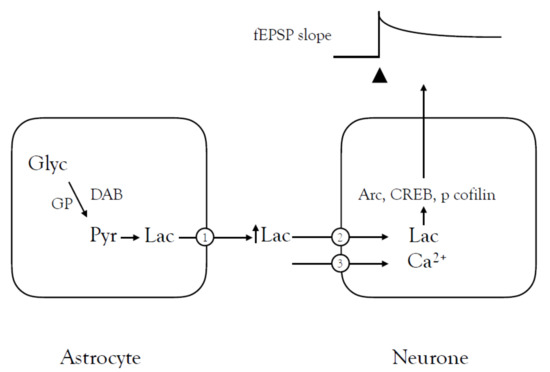 Studies in rodent hippocampus have revealed the importance of lactate shuttling during learning and memory. The initial comprehensive study used both electrophysiology to study long-term potentiation (LTP) in hippocampal slices and whole animal behavioural work [57]. The slice studies showed that LTP could be demonstrated in CA1 neurones as a result of Schaffer collateral stimulation with the increased fEPSP slope, the classic indication and monitor of increased synaptic efficacy. Application of the glycogen phosphorylase inhibitor DAB prevented the maintenance of LTP but this effect could be circumvented by exogenous application of lactate, indicating that lactate uptake by neurones was required for the induction of LTP and the neurones must have access to the lactate during the conditioning phase. Application of lactate after the conditioning stimulus does not restore LTP, suggesting that the conduit role of lactate as a transportable energy substrate in LTP was analogous to the optic nerve studies, where the energy-dependent conditioning stimulus imposes a heavy metabolic demand on the tissue. If there is no access to lactate at this time, LTP does not occur, indicating that when tissue energy demand exceeds supply there is a functional failure. The behavioural tests were conducted using an aversive fear conditioning protocol as a test for memory. Rats were placed in a chamber connected to another chamber, which was accessed via a door. The natural inquisitiveness of the rats compels it to explore and it will soon enter the second chamber. When this occurred, the rat was given an electric foot shock and then replaced in the initial chamber. The time taken for the rat to re-enter the second chamber is an indication of its memory, the longer the latency the greater the memory. The latency under control conditions was about 300 s, but this was greatly reduced when the rat was injected with DAB 15 min before the conditioning pulse, and the inhibitory effect of DAB lasted for up to a week. Injection of DAB after the conditioning pulse had no effect on the latency. Sampling of extracellular fluid lactate with a dialysis probe in the hippocampus showed elevations in lactate in the immediate aftermath of the conditioning pulse that relaxed back towards baseline after about 30 min, but this lactate increase was abolished when DAB was injected into the hippocampus prior to the conditioning stimulus. The study demonstrated for the first time a role for lactate shuttling between glia and neurones in a physiological process, i.e., learning and memory [57] (Figure 2). The importance of this is reflected in the studies that followed in its wake.