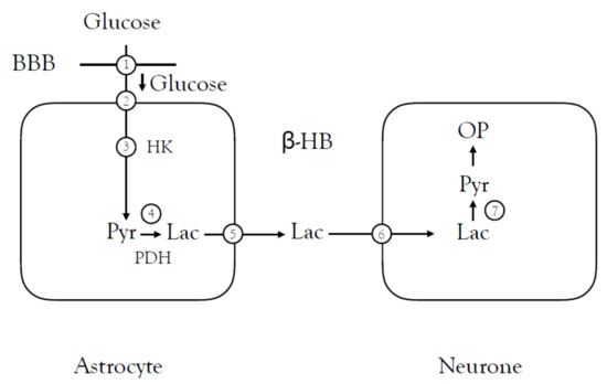 Disruptions in lactate shuttling in Alzheimer’s disease. In mouse models of AD, there is a generalised decrease in glucose uptake at 6 to 9 month of age, which was sustained at 12 to 15 months, facilitated by down-regulation of the blood brain barrier (BBB) Glut1 (1) and the neuronal Glut3 (2) transporters. The levels of hexokinase expression (3) were reduced but PDH activity (4) was increased, which reduced conversion of pyruvate to lactate. The expression of the astrocytic MCT4 (5) and the neuronal MCT2 (6) were down regulated, but the levels of the ketone body β-hydroxybutyrate (β-HB) were increased. The lactate is converted to pyruvate (7).