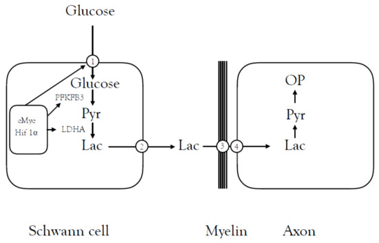 The role of Schwann cell lactate shuttling in PNS axonal regeneration was further investigated in a study in which peripheral nerves were injured in a mouse model. In response to the energy requirements associated with regenerating axons, the Schwann cells underwent a phenotypic change in which they increased their glycolytic capacity by increasing the expression of all glycolytic enzymes. This increased the production of pyruvate and lactate and increased expression of the glucose transporter Glut1 on Schwann cells, facilitating glucose uptake. LDHA was increased which converts pyruvate to lactate, and was likely involved in the reported elevated uptake and metabolism of glucose and increased production and release of lactate. Soon after axotomy there was increased expression of MCT1 and MCT4 transporters, which serve to facilitate lactate exit from the Schwann cell. The rapid increase in AMPK activated protein kinase and mTOR complex 1/2 in the aftermath of injury is suggestive that these signalling pathway are associated with the lactate release and uptake by the axons [90] (Figure 4).