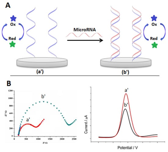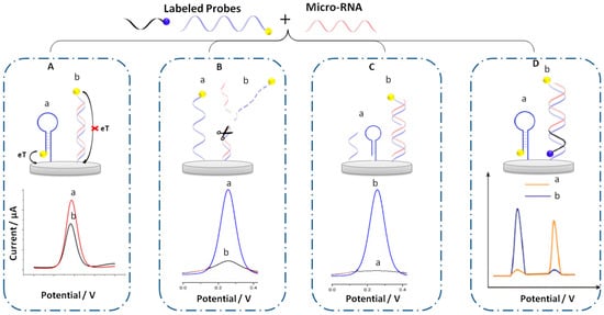 Different architecture of electrochemical biosensors based on labeled probe with RedOx molecules before and after hybridization. (A) Basic design; (B) elimination of labeled probe sequence; (C) the use of secondary probe labeled with RedOx molecule; (D) the use of two-probe labeled sequence, (a) before and (b) after hybridization.