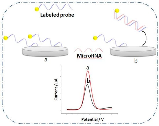 Using a new way for probe capture immobilization, Torrente-Rodríguez et al. [102] employed magnetic-beads (MBs) modified with a special DNA–RNA antibody as capture probe bioreceptor. The antibody recognized the hybridized microRNA and biotinylated capture probe linked to SA-HRP. Indeed, amperometric detection implying the H2O2/HQ system at disposable SPCE was performed. This methodology has been evaluated for the quantification of miRNA-205 and miRNA-21 in total RNA obtained from human breast tissues.