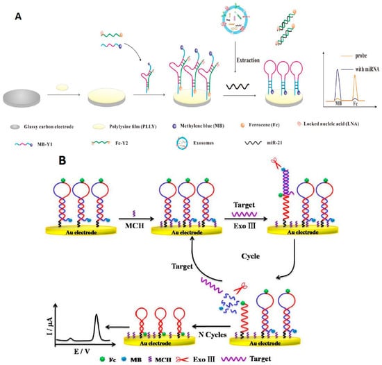 Amplification strategy using exonuclease-assisted target recycling [63] (Figure 4B) or mismatched catalytic hairpin assembly (CHA) [65] can improve the signal-to-background ratio of the sensor. Using this type of ratiometric design, Zhang et al. [64] developed a more original biosensor based on bipedal DNA walkers for the detection of exosomal miRNA-21. Fc and MB RedOx probes produce a final ratiometric signal, allowing them to obtain an LOD up to 67 aM of miRNA-21. The biosensor developed was applied in a real sample and compared with other methods as RT-qPCR and was regenerated five times without signal decrease.