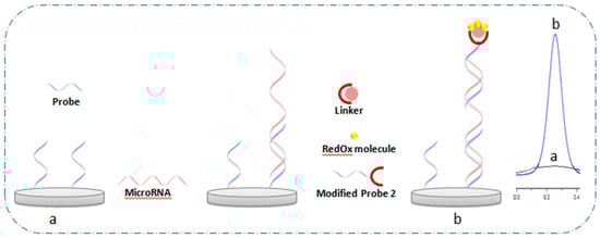 Another method uses the competition of miRNA target with two DNA probes in which one is non-labeled and could be hybridized with an MB-labeled duplex reporter. When miRNA target is present, its hybridization reaction with a non-labeled attached probe takes place leading to the displacement of the labeled reporter from the surface [54].