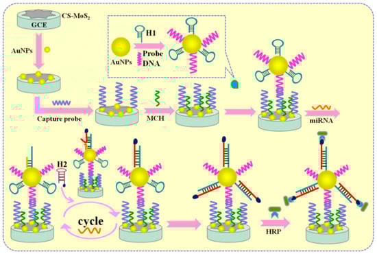 Other works for miRNA detection based on enzymatic reaction reported the use of CHA, which is initiated by the presence of target miRNA [109,110,111,112]. CHA allows the infinite recycling of miRNA to create a mass of streptavidin-enzyme modified signal probes, leading to an enhancement of electrochemical response. Additionally, to further enhance the sensitivity for miRNA detection, nanomaterials linked to enzymes were used. In this regard, Chen et al. [109] proposed a sandwich system integrating CHA and carbon sphere-MoS2 (CS-MoS2)/AuNPs for the immobilization of capture DNA (see Figure 7). AuNP-modified biotinylated signaling probes were employed as carriers of Avidin-HRP, which catalyze the H2O2 + HQ system to produce a strong electrochemical response, used for sensitive miRNA detection, to achieve a lower LOD of 0.16 fM.
