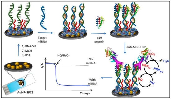 Zouari et al. [117] developed an electrochemical AuNP-based biosensor platform that was used for miRNA detection. Indeed, RNA/miRNA homoduplexes were recognized with the viral protein p19, labeled with a HRP-conjugated anti-maltose binding protein monoclonal antibody (see Figure 8). The bioplatforms present at least 2 months of storage stability. Additionally, the analysis of miRNA in total RNA extracted from healthy and cancerous breast cells was performed using the proposed biosensor.