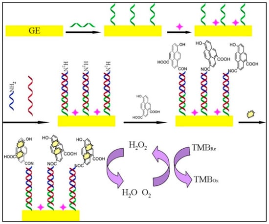 There is another way for enzyme immobilization at the electrode surface for miRNA detection. Indeed, graphene quantum dots (GQDs) have a large surface-to-volume ratio, excellent compatibility of GQDs were used as a new platform for a large amount of HRP immobilization through the non-covalent assembly (see Figure 9). In this work, a sandwich system was employed for miRNA-155 detection integrating capture probe and signaling probe modified with NH2 conjugated with QDs-HRP. The proposed biosensor is permitted to reach an LOD of 0.14 fM in a linear range from 1 fM to 100 pM [118]. Otherwise, an electrochemical biosensor for miRNA-221 detection using CHA and also a sandwich system based on the use of HRP directly labeled to signal probe was reported. HRP was used to catalyze the reaction of TMB/H2O2 for amperometric detection of miRNA-221 [119].
