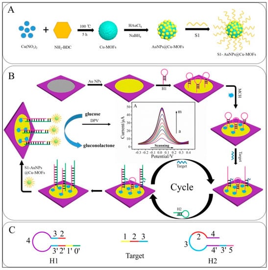 Schematic illustration of the fabrication of the biosensor: (A) preparation procedure of S1-AuNPs@Cu-MOFs; (B) the detection principle for glucose and the strategy of signal amplification; (C) structure of H1, target, and H2 (reproduced with permission from the publisher) [120].