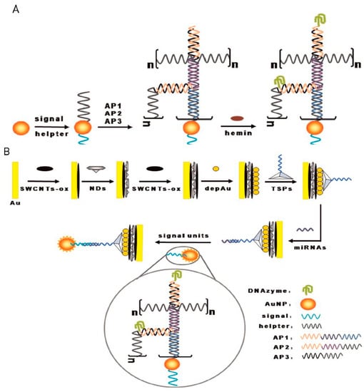 (A) DNA-functionalized AuNP based hybridization chain reaction, (B) Schematic illustration of miRNA biosensor using layered nanostructure of oxidized single-walled carbon nanotubes and nanodiamonds by hybridization chain reaction (reproduced with permission from the publisher) [129].