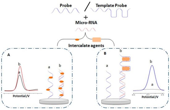Example of biosensor obtained with two DNA label with two RedOx markers; (A) standard design reproduced from [68] with permission of publisher, (B) same approach using amplification strategy reproduced with permission of the publisher from [63].